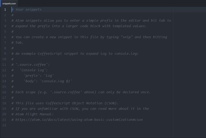 I have been pulling my hair out trying to finds a solution to this problem. Select open your snippets cut and paste the contents of snippets.cson into your snippets.cson file; 24.02.2016 · custom snippets are defined in the snippets.cson file located in your ~/.atom folder. I have been pulling my hair out trying to finds a solution to this problem.. 24.02.2016 · custom snippets are defined in the snippets.cson file located in your ~/.atom folder.